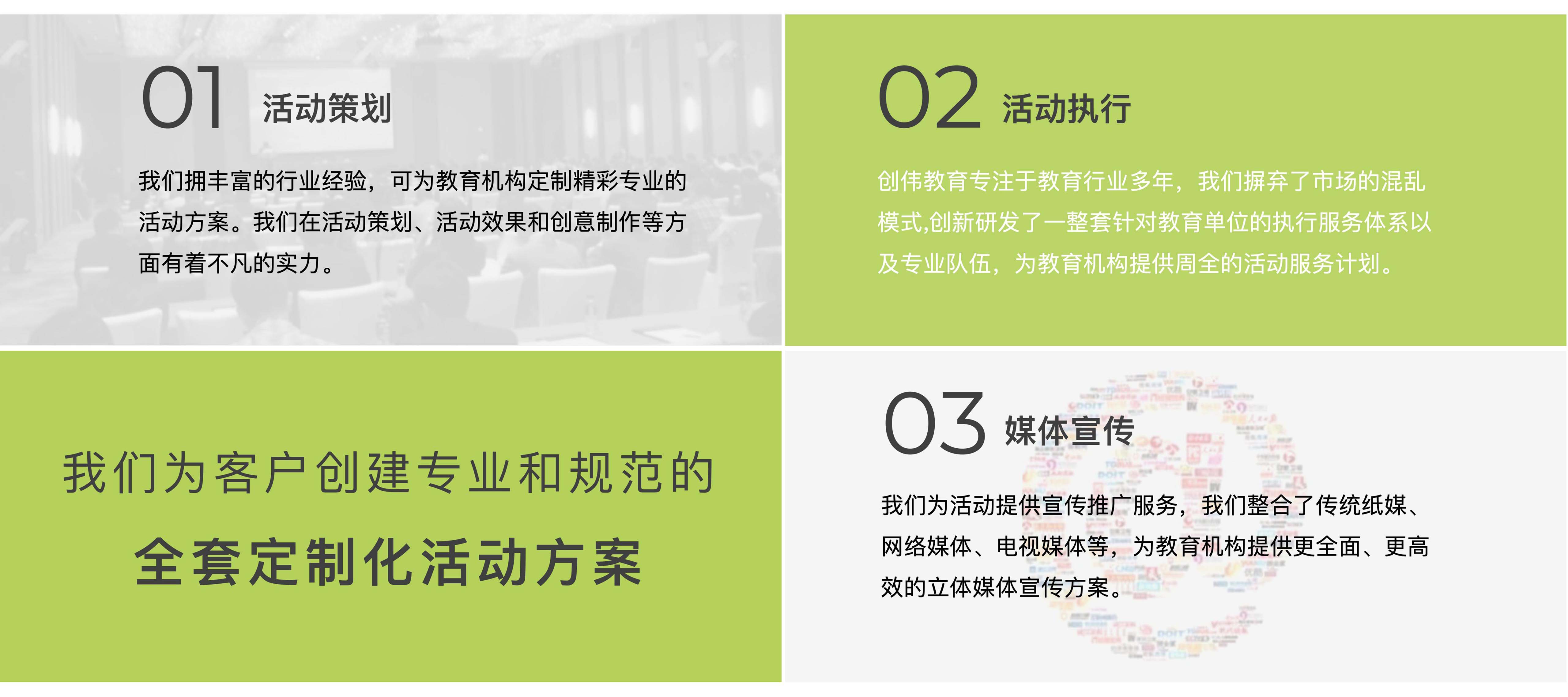 創(chuàng )偉教育依托十余載的活動(dòng)承辦經(jīng)驗,在活動(dòng)服務(wù)領(lǐng)域展現出顯著(zhù)優(yōu)勢,致力于為客戶(hù)提供全方位、高品質(zhì)的活動(dòng)承辦服務(wù)。